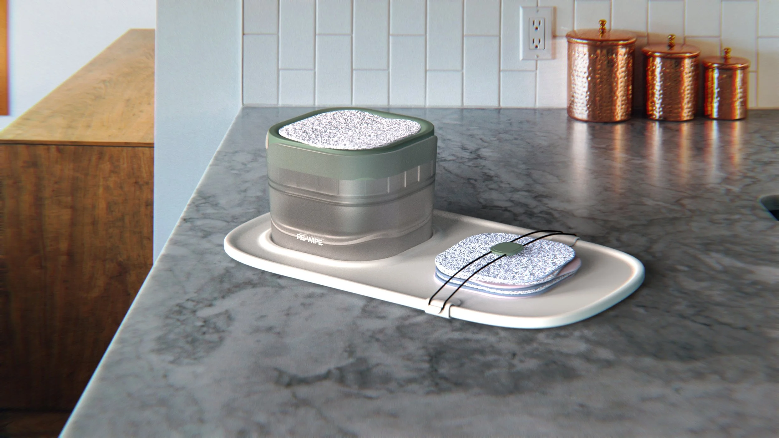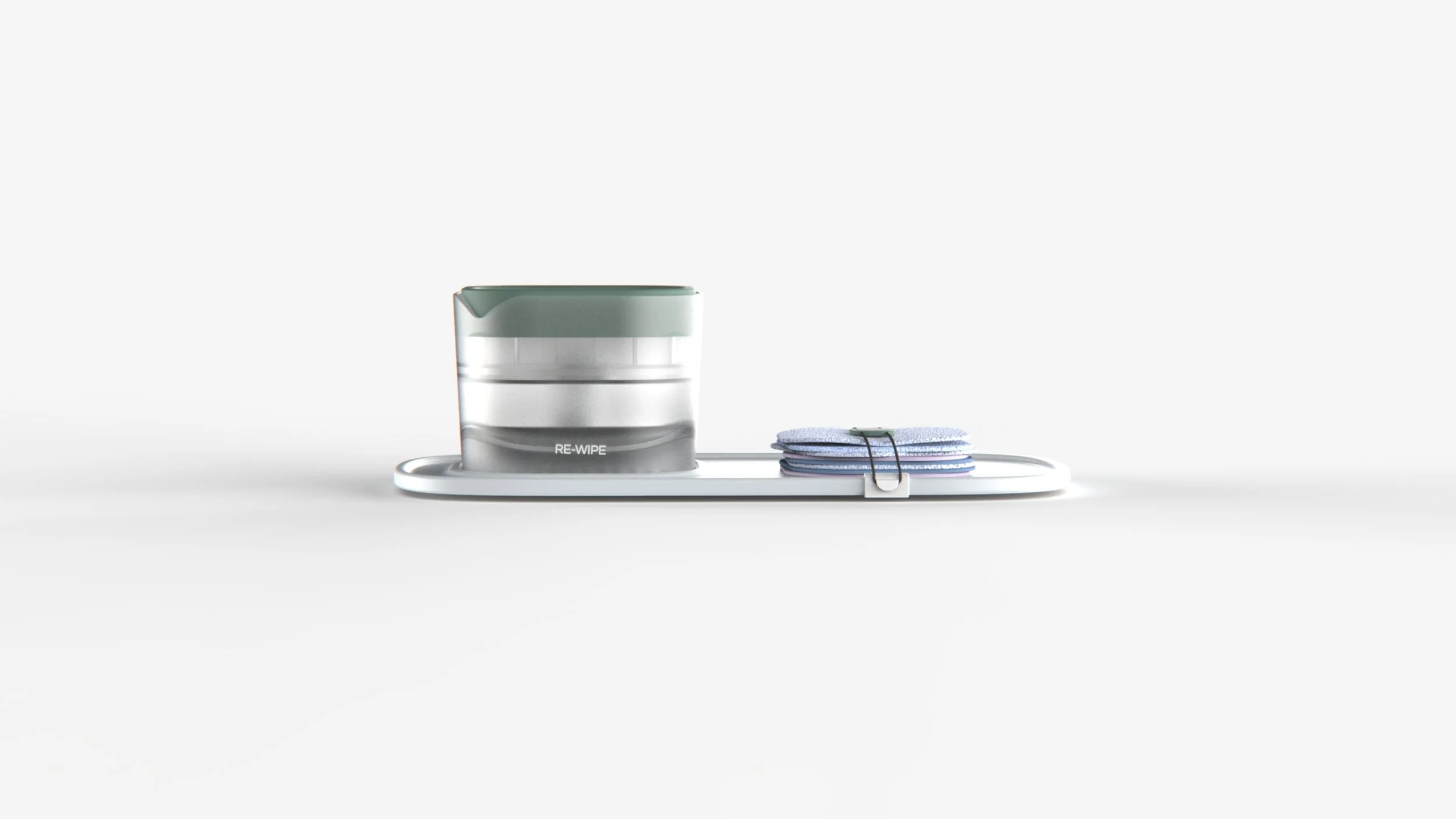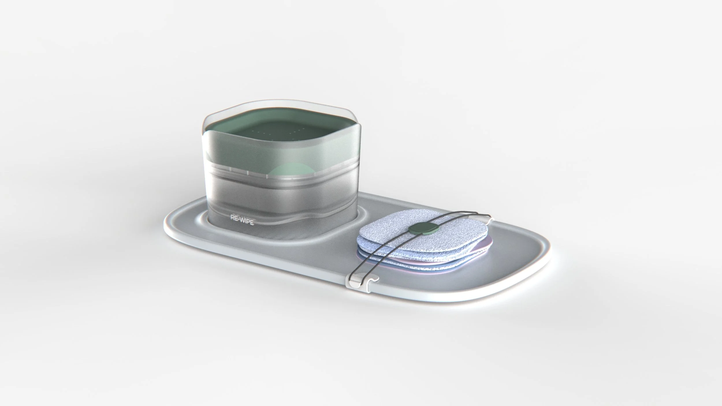 Disposable baby wipes are being replaced with reusable wipes; however, these are currently less convenient in terms of use and storage. Reusable wet wipes can be prepared and stored in boxes with a dispensing feature, or with a pump bottle which can be messy and add clutter to the home. This is where the Re-Wipe Station comes in.