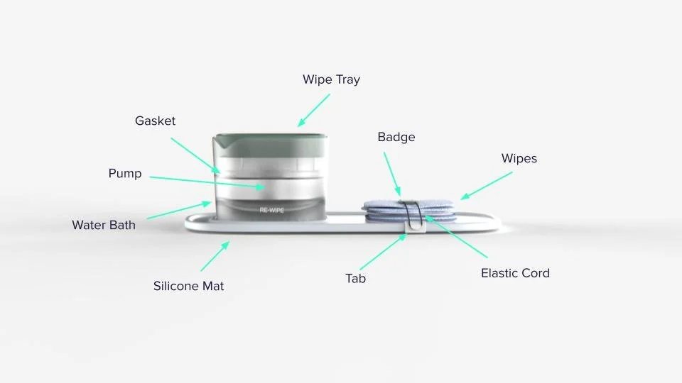 To use, a reusable wipe is placed on the wipe tray and pushed down, which causes water to feed through the hole pattern, wetting the cloth.